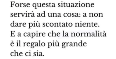 1. Bellissimissima riflessione.E’ proprio così questo pit stop forzato ci fa riconsiderare le cose con un altra consapevolezza,che in tempi normali consideriamo,appunto,normali.Spero che quando questo scempio sarà finito non si torni alla leggerezza,nei rapporti interpersonali,di prima,si sarebbe sprecata un opportunita di crescita.